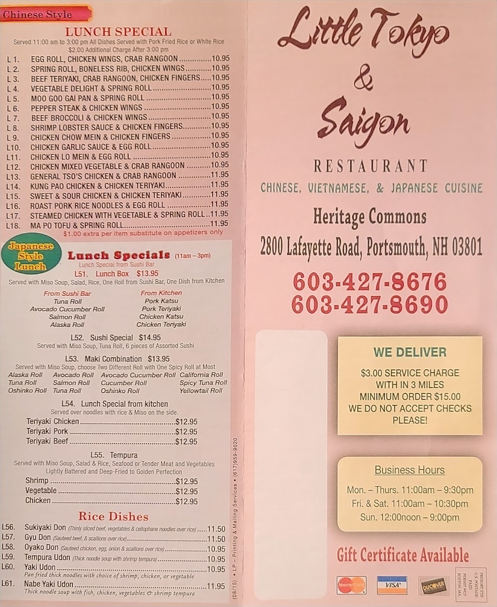 Welcome to Little Tokyo & Saigon, a culinary gem at 2800 Lafayette Rd, Portsmouth, NH. This restaurant beautifully melds Japanese and Vietnamese cuisines, offering a diverse menu that delights every palate. The ambiance is warm, with low lighting and a decor that evokes the bustling streets of both Tokyo and Vietnam.